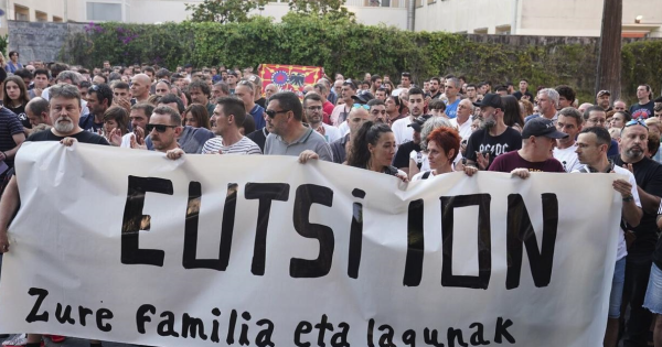 Eutsi Ion! Zurekin gaude! Zure familia eta lagunak!, se podía leer en la pancarta tras la cual posaron todas las personas que se juntaron en la plaza. Tras unos minutos de silencio y emoción, dos de los amigos de Ion Aranburu leyeron un comunicado relatando lo sucedido el sábado 27 de mayo en Soria, día en el que este aficionado de la Real Sociedad recibió una brutal paliza que le dejó inconsciente y que a día de hoy le tiene en coma en el hospital de Burgos.