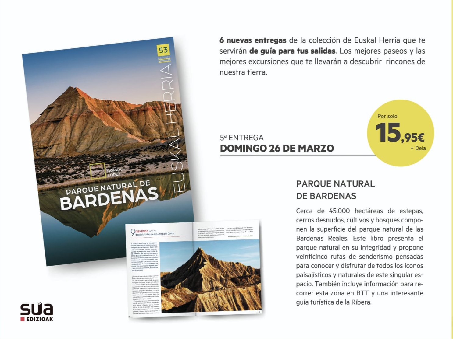 Este domingo 26 de marzo con Deia 5ª entrega de la colección Euskal Herria: Parque natural de Bardenas. Su autor Gorka López nos propone una guía para adentrarnos en las 41. 845 hectáreas que integran esta Reserva de la Biosfera y diferenciar entre la Bardena Blanca y la Negra.