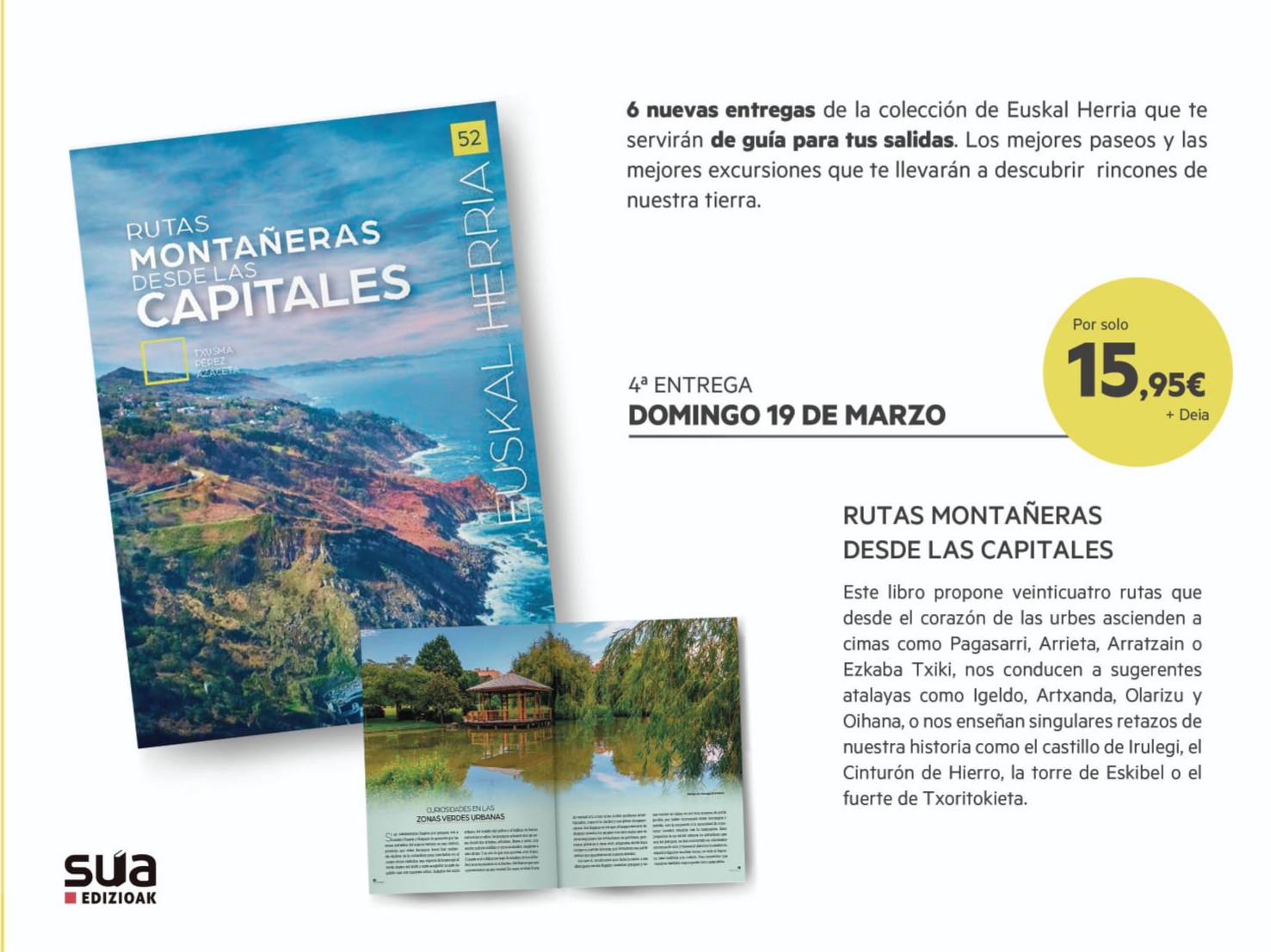 Este domingo 19 de marzo con Deia 4ª entrega de la colección Euskal Herria: Rutas Montañeras desde las capitales. Su autor Txusma Pérez Azaceta nos propone 24 rutas desde el corazón de Bilbao, Donostia, Vitoria-Gasteiz e Iruña.