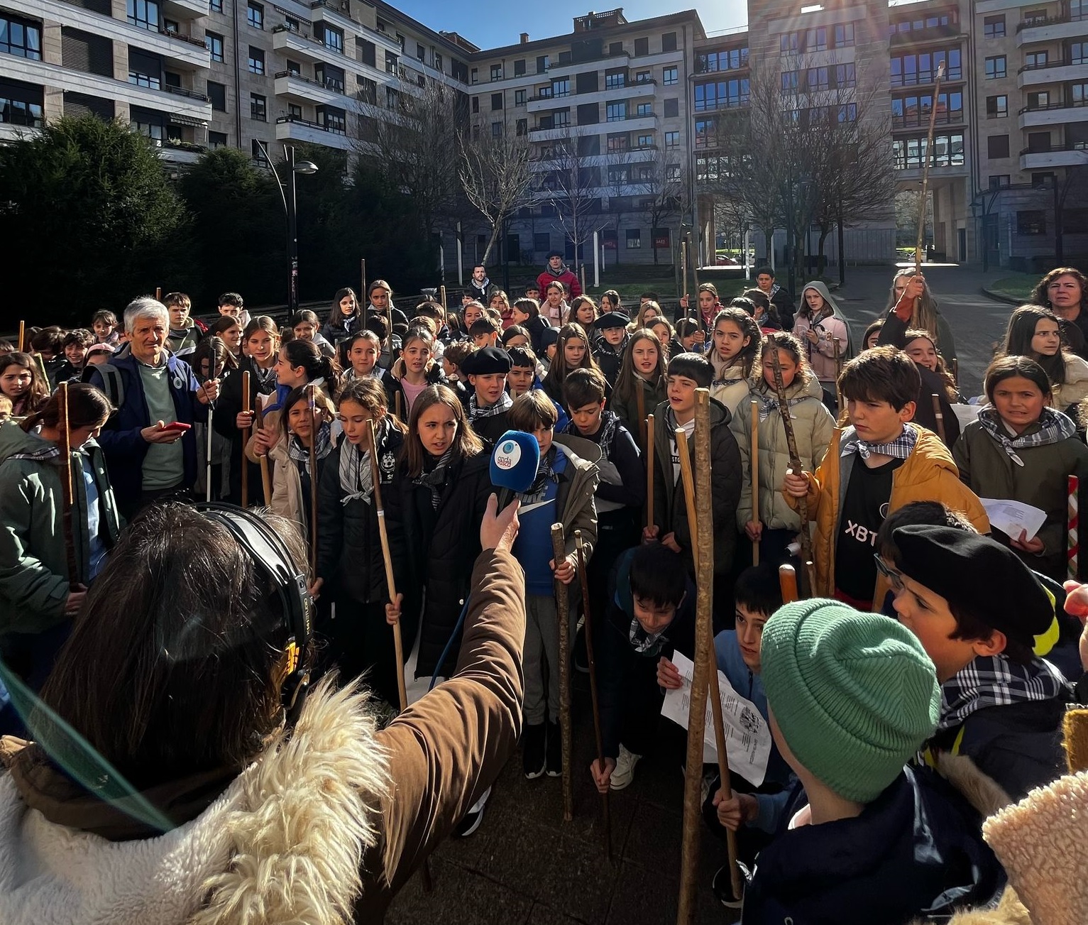 Esto en Bilbao, mientras junto a los estudios de ONDA VASCA en Donostia nuestra compañera Esther Fernández recibía a las y los alumnos de la ikastola Santo Tomas Lizeoa de Donostia que apenas podían aguantar los nervios para contarnos que venían a cantarnos en este día tan especial.