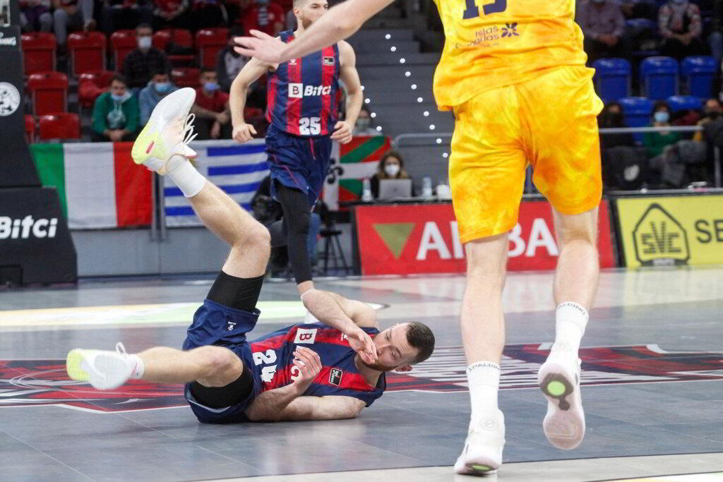 Costello, por los suelos, durante el partido ante el Gran Canaria Eso sí, habida cuenta de que esta semana no hay partido de Euroliga y tan solo hay que disputar un encuentro, el domingo en Burgos, se actuará con cautela para evitar una posible recaída en las molestias. El jugador estará las primeras sesiones de la semana entre algodones y los servicios médicos del club irán comprobando la evolución diaria de su tobillo.