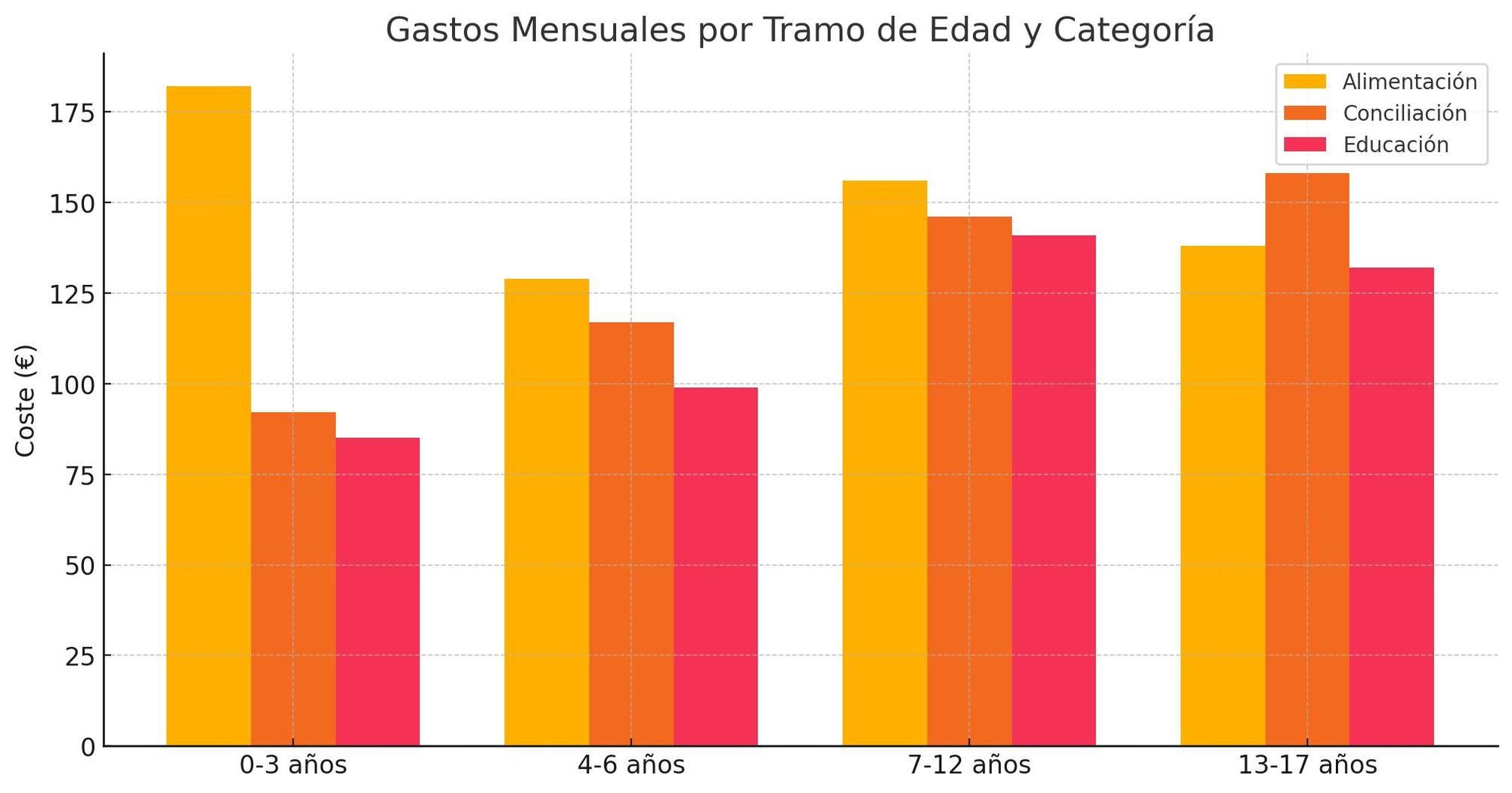 El coste medio mensual de la crianza se distribuye entre varias áreas esenciales como alimentación, ropa y calzado, higiene, educación, ocio, sanidad y vivienda. A lo largo de los años, estos gastos evolucionan según las necesidades de los niños y niñas. Los mayores incrementos en el gasto se registran en la etapa de 7 a 17 años, cuando el desembolso en alimentación y en productos tecnológicos se vuelve más significativo.