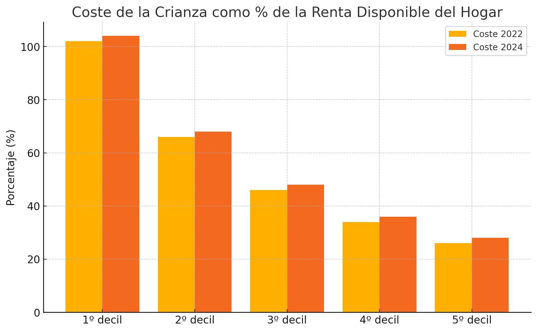 Además, el coste de la crianza ha experimentado un aumento del 13% respecto a 2022, lo que refleja la constante alza en los precios de los productos esenciales. Este incremento afecta principalmente a las familias con menos recursos, que encuentran cada vez más dificultades para cubrir los gastos básicos relacionados con la crianza.