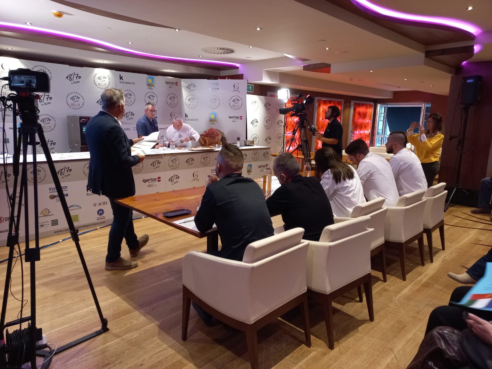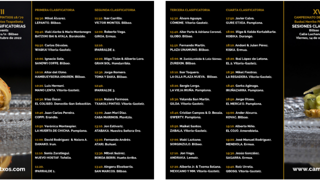 La actividad es frenética en el espacio Bilbao Events del edificio Coliseo, en Bilbao. Allí se celebra, desde las 9:30 de la mañana, el XVII Campeonato de Pintxos 18/70 de Euskadi y Navarra. Este certamen gastronómico, que organiza la Asociación de Hostelería de Hondarribia, recala por primera vez en Bilbao tras pasar por Donostia y Vitoria-Gasteiz en anteriores ediciones. Hoy tienen lugar las cuatro rondas clasificatorias, de las que saldrán los 12 finalistas que se medirán en la gran final del domingo.