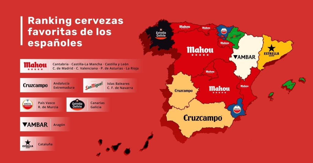 El resto de las marcas se repartes las comunidades a pares. Así, Estrella Galicia es la preferida en Galicia (sorpresa sorpresa) y Canarias, Cruzcampo se lleva de calle a Andalucía y Extremadura, Amstel une la Cantábrico y el Mediterráneo al ser la favorita de Euskadi y Murcia, mientras que Navarra y Baleares se muestra de acuerdo en sus preferencias por San Miguel. Finalmente, en sendos ejemplos de lealtad local, Aragón se inclina decididamente por la cerveza Ambar y Catalunya dirige su interés hacia Estrella Damm.