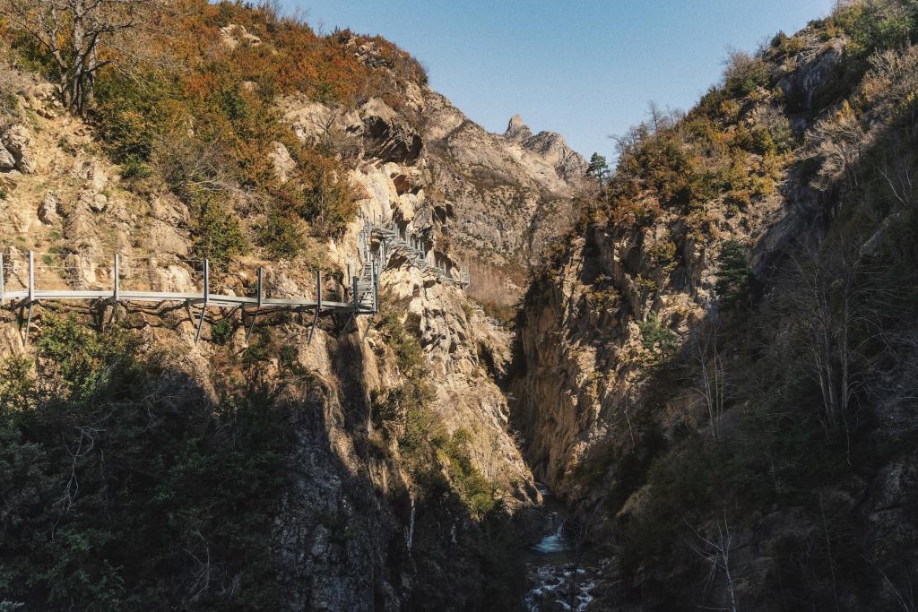La pasarela salta de una pared a otra a 25 metros de altura. Foto: Pasarelas de Panticosa Una vez concluido el recorrido por aereofluvial, se sale a un sendero que atraviesa una zona boscosa hasta llegar a un cruce. Ahí se plantean dos opciones, seguir hacia la izquierda para llegar hasta el Mirador O'Calvé o tomar el de la derecha para volver a Panticosa por el camino de As Paúles y el barranco Bachato. Salvo circunstancias muy especiales, lo aconsejable es la primera opción, merece la pena.