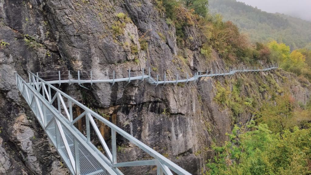 Este primer tramo, muy vertical sobre el río, lleva a la pasarela colgante que cruza al otro lado de la garganta y muestra una vista espectacular del abrupto barranco por el que se transita y que el río Caldarés ha erosionado durante miles de años. El fondo queda 25 metros por debajo de los pies de los aventureros.