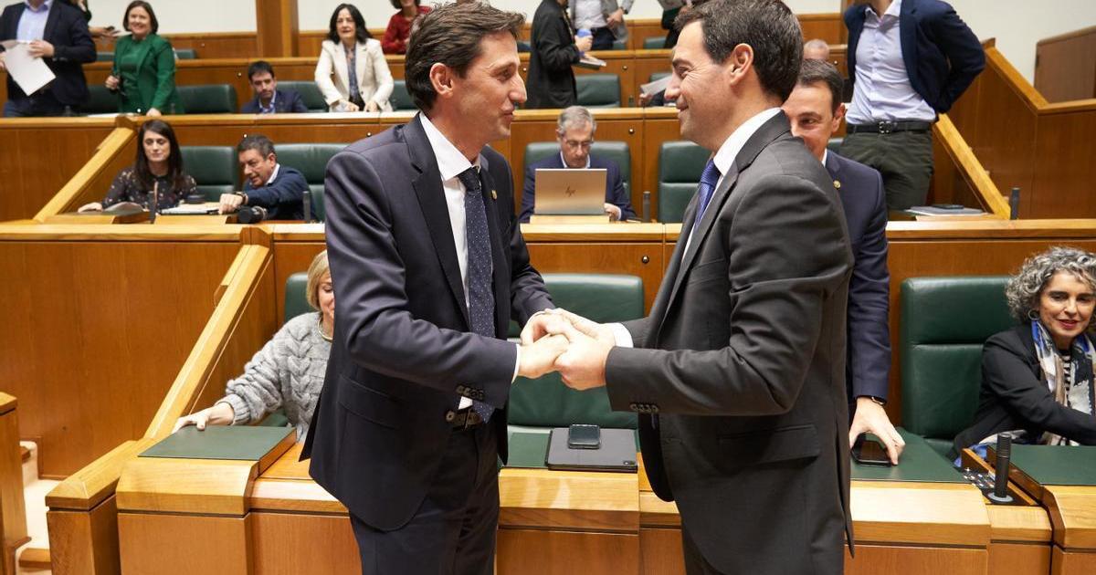 El consejero de Hacienda y Finanzas, Noël d'Anjou, con el lehendakari Pradales, en una anterior sesión del Parlamento Vasco / Efe