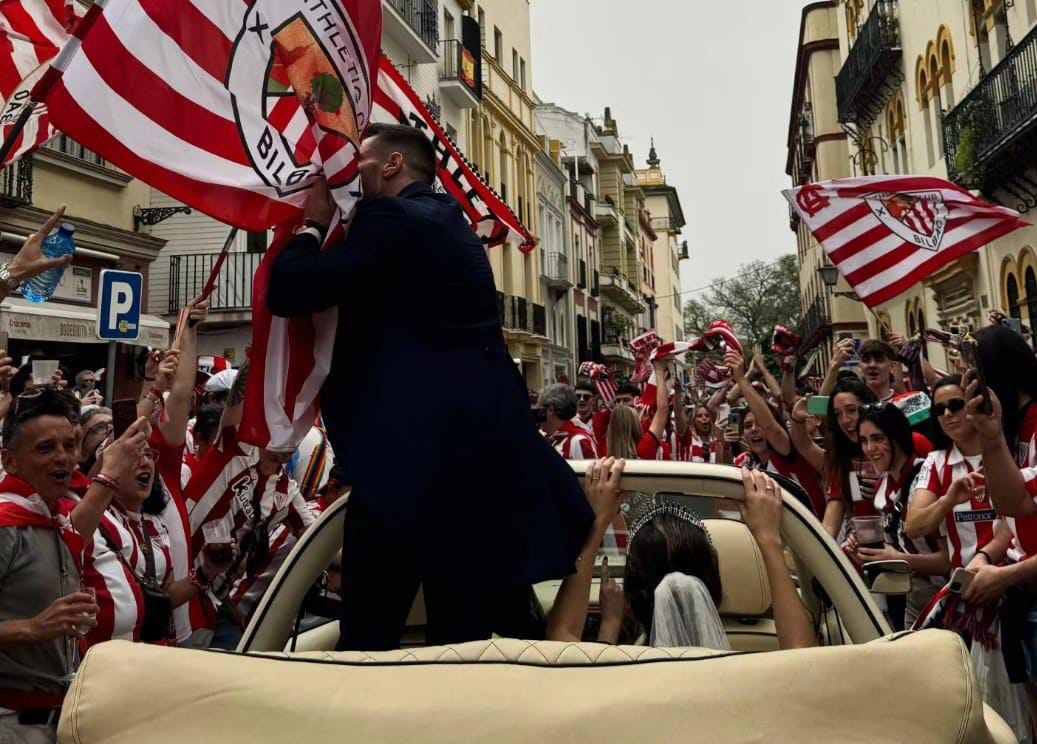 "Son del Athletic, los novios son del Athletic". Se hicieron virales el pasado abril en la vorágine de la final de Copa. Aquella boda celebrada en la Catedral de Sevilla junto a miles de aficionados del Athletic convertidos en invitados de honor les ha transformado en embajadores rojiblancos al punto de que este sábado los veremos en el palco de la otra "catedral", la de San Mames.