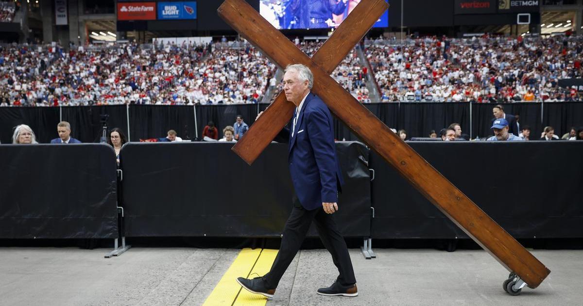 Dan Beazley, que recorre EE.UU. con su cruz, en el acto de homenaje a Charlie Kirk en Arizona.