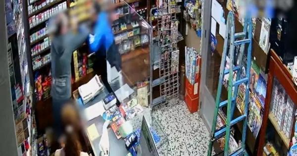 Uno de los atracadores forcejea con el dueño del estanco de Murillo de Rio Leza..