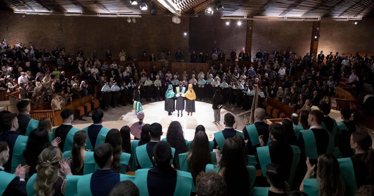 El evento, que se inició con la interpretación del 'Agur Jaunak' a cargo de Easo Gazte Abesbatza, incluyó un interludio musical en el que sonó 'Txoriak txori', de Mikel Laboa, y concluyó con el tradicional 'Gaudeamus Igitur'.