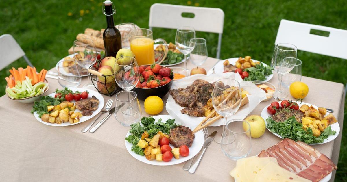 Mesa con la comida lista para degustar al aire libre.