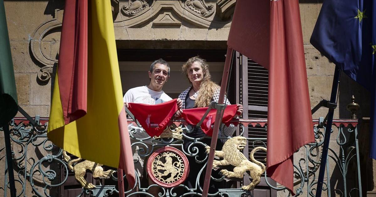 "Es el único guiño que se nos permite en la indumentaria, porque no es posible salirse del protocolo", explicaba la portavoz de Yala Nafarroa con Palestina, la mujer protagonista de este 6 de julio en Pamplona. Ella ha dado el mensaje en castellano, Eduardo Ibero en euskera y, junto a Dyna Kharrat, han prendido la mecha, que, por un instante, parecía que se resistía.