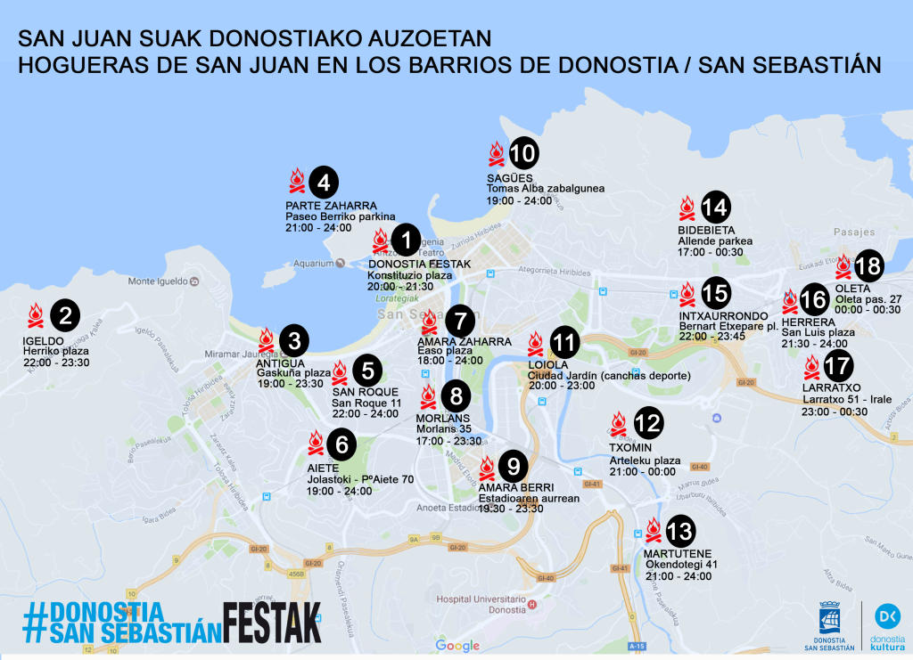 Otros puntos de la ciudad en los que se organizan festejos con encendido de hoguera son Igeldo (a partir de las 22.00 horas), la plaza de Gaskuña de El Antiguo (19.00 horas), el Paseo Nuevo (21.00 horas), San Roque (22.00 horas), el Jolastoki de Aiete (19.00), plaza Easo (18.00), Morlans (17.00), plaza del estadio de Anoeta (19.30 horas), plaza Tomás Alba de Sagüés (19.00), cancha de Ciudad Jardín de Loiola (20.00), plaza Arteleku de Txomin (21.00), Okendotegi (21.00) parque Allende de Bidebieta (15.00), plaza Bernat Etxepare de Intxaurrondo (22.00), plaza San Luis de Herrera (21.30), Larratxo (23.00) y Oleta (00.00 horas).