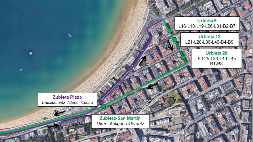 E dirección a La Concha, los autobuses transitan por las calles Urbieta y San Martín. Las paradas del hotel Londres, Zubieta 14 y La Perla (Zubieta 42) desaparecen. En su lugar, se habilita otra parada en Zubieta-San Martín y otra en la calle Urbieta. Las líneas 16, 18 y B7 pararán en Urbieta 6, junto a las líneas 19, 26 y 31, mientras que las líneas 5, 25, 33, 40, 45, B1 y B8 lo harán en Urbieta 20.