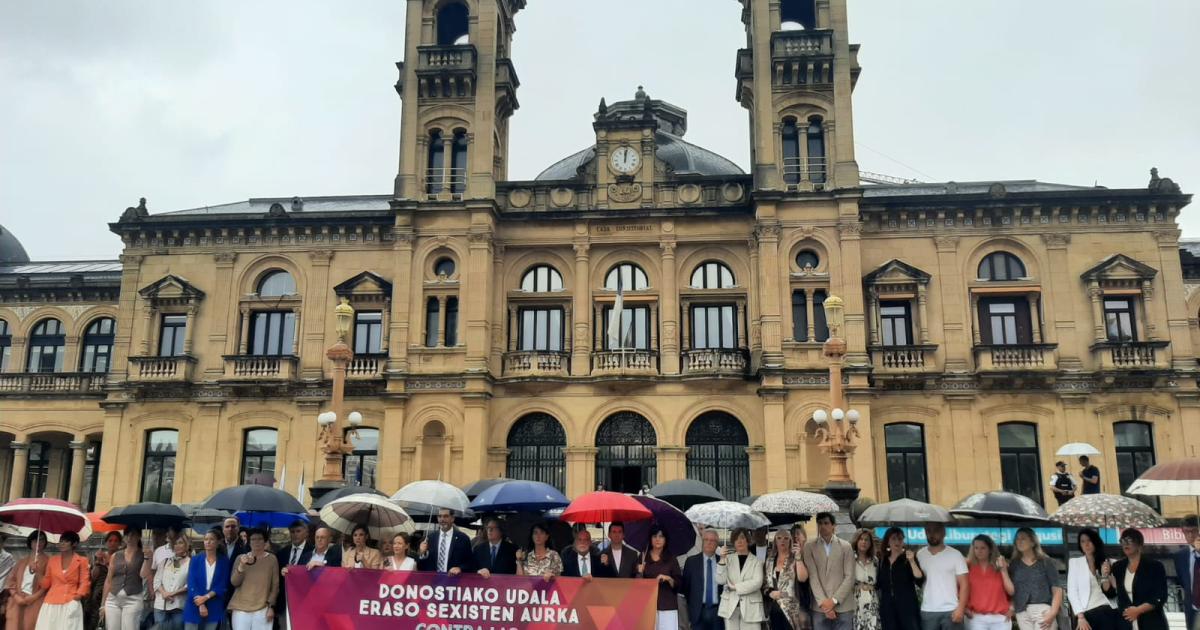 Bajo una fina e incesante lluvia, Donostia ha mostrado este mediodía su repulsa ante la última agresión sexual denunciada en la ciudad. Un hombre ha sido detenido y ha ingresado en prisión, acusado de golpear y violar a una mujer, este fin de semana, en un asentamiento situado en el barrio donostiarra de Aiete. Todos los grupos políticos del Ayuntamiento de Donostia han secundado la concentración de este mediodía. Hoy han estado acompañados por los responsables políticos de las Juntas Generales de Gipuzkoa que, esta mañana precisamente, han celebrado el pleno itinerante de final de curso en el Ayuntamiento donostiarra.