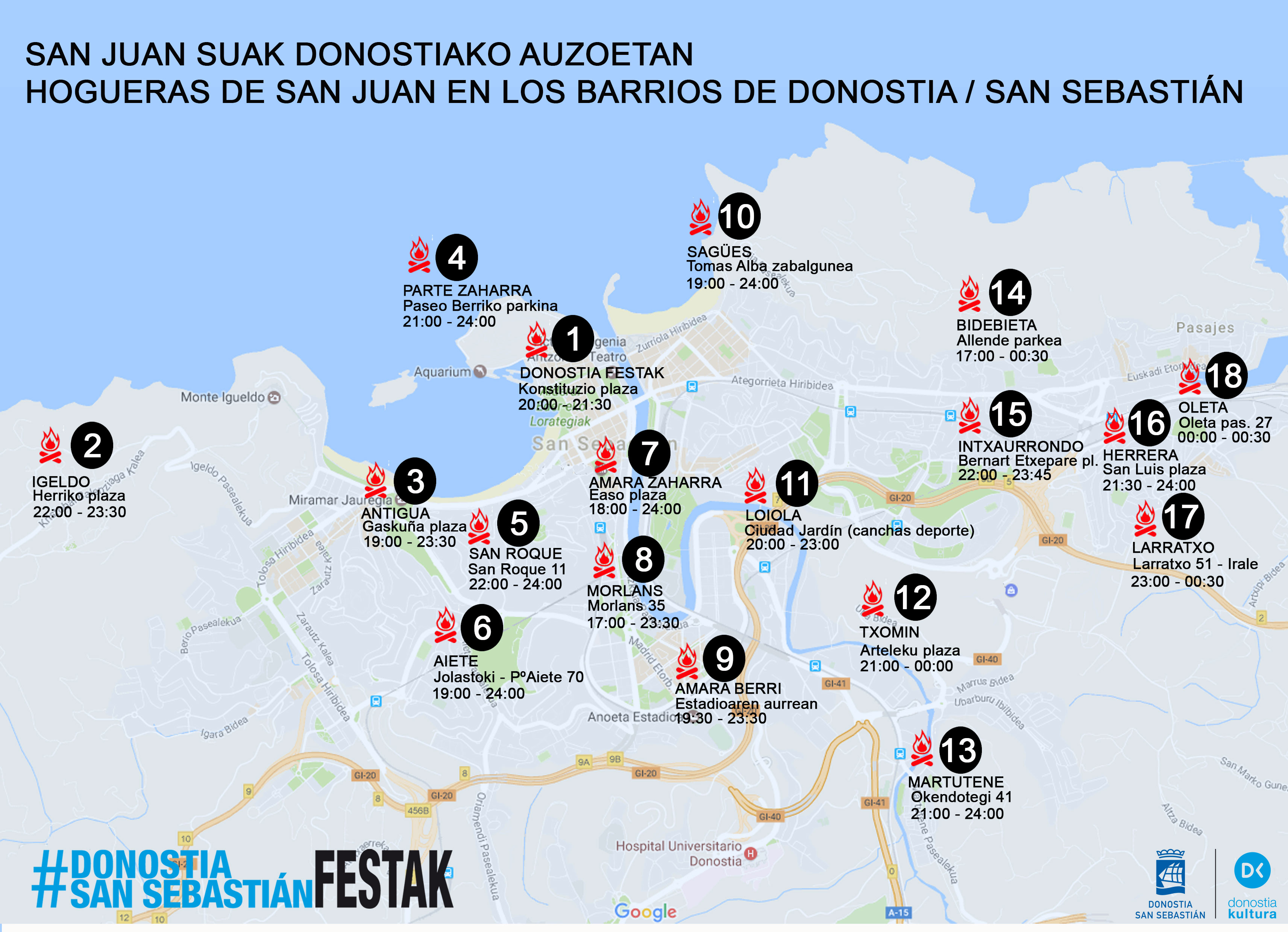 Por su carácter festivo, el día 23 volverá a ser uno de los días marcados en rojo en el calendario al celebrar la llegada del verano y el solsticio, ese momento del año en el que el día es más largo que la noche. La madera del fresno de la plaza de la Constitución será una de las primeras en arder pero, a partir de las 21:00 y hasta la medianoche, irán encendiéndose otras 17 hogueras en los barrios de la ciudad. Donde no está permitido hacer fuego es en la playa de la Zurriola, lugar habitual de encendido de hogueras y aunque el Ayuntamiento asegura que habrá controles apela sobre todo a la responsabilidad individual.
