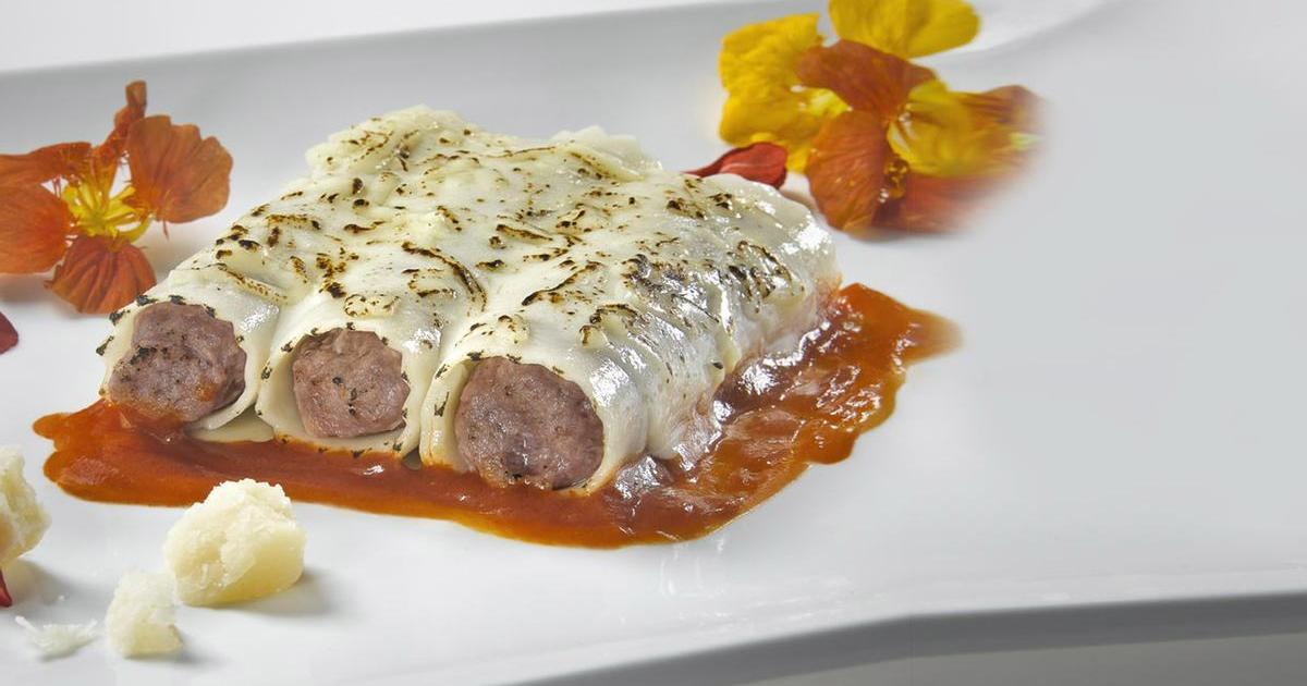 Rellenar los canelones y enrollar, poner en una fuente de horno con tomate de base. Cubrir con la salsa bechamel restante y añadir queso Roncal rallado.