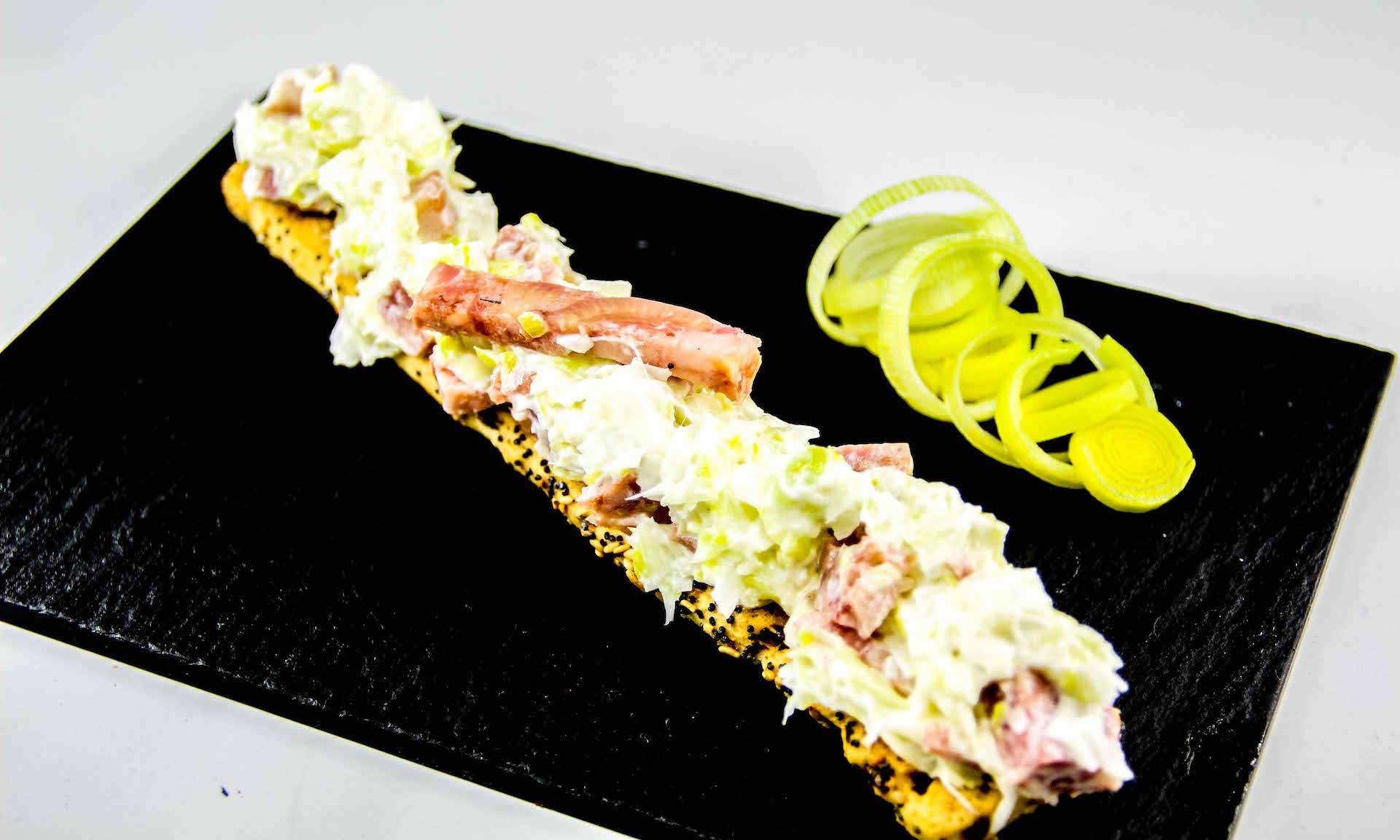 Gerardo Maza reinventa la ensaladilla rusa en una versión sin patata ni bonito pero con puerro y cabeza de jabalí y en otra versión más tradicional pero que nos presenta en cucurucho, como si fuera un helado.