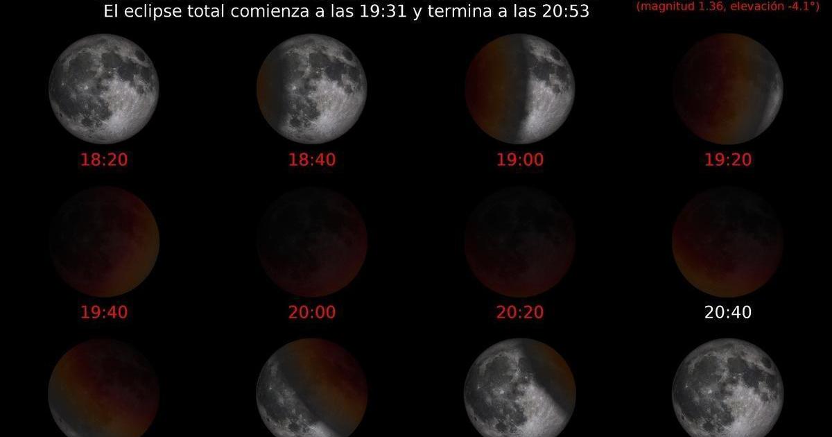 El eclipse se desarrollará entre las 18:27 y las 21:56 hora peninsular, con su punto álgido a las 20:11, aunque no se verá de la misma manera en todo el territorio. En la mayor parte de la península, Baleares, Ceuta y Melilla la luna saldrá ya totalmente eclipsada, por lo que se apreciará el final de la fase total. Sin embargo, en el oeste de Galicia y en las Islas Canarias la fase total habrá terminado en el momento de la salida de la luna, por lo que solo se verá el final de la fase parcial.