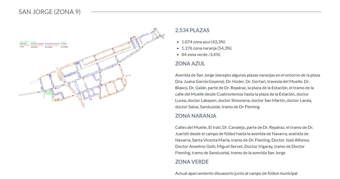Las plazas naranjas coinciden con las calles del Muelle, El Irati, Dr. Canalejo, parte de Dr. Repáraz, el tramo de Dr. Juaristi desde el campo de fútbol hasta la avenida de Navarra y las plazas ubicadas en esa misma avenida de Navarra. Asimismo, serán naranjas las plazas comprendidas entre Santa Vicenta María, Dr. Fleming, José Alonso y Sanduzelai, excepto un tramo de esta última calle.