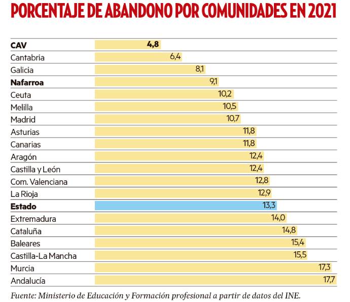 La media estatal esconde profundas diferencias entre comunidades. Sirva como ejemplo el hecho de que Andalucía triplica el abandono de Euskadi. La CAV (4,8%), Cantabria (6,6%) y Galicia (8,1%) lideran el ranking autonómico. Les sigue inmediatamente después Nafarroa (10,2%) que, aunque ha reducido tres puntos el abandono respecto a 2020, sigue sin superar esa barrera psicológica del 10%. Con todo, desde el Ministerio de Educación no han dejado pasar la oportunidad para considerar ese 13,3% como un logro. Y en cierta manera lo es ya que en 2004 prácticamente un tercio de los españoles de 18 a 24 años no tenía el título de Bachillerato o FP.