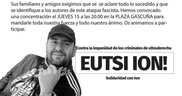 La Policía no ha encontrado a los responsables de propinarle los golpes, por lo que los familiares y amigos de Aranburu exigen "que se aclare todo lo sucedido y que se identifique a los autores de este ataque fascista. Hemos convocado una concentración el jueves 15 a las 20.00 horas en la plaza Gascuña del barrio del Antiguo para mandarle toda nuestra fuerza y todo nuestro ánimo. Os animamos a participar".