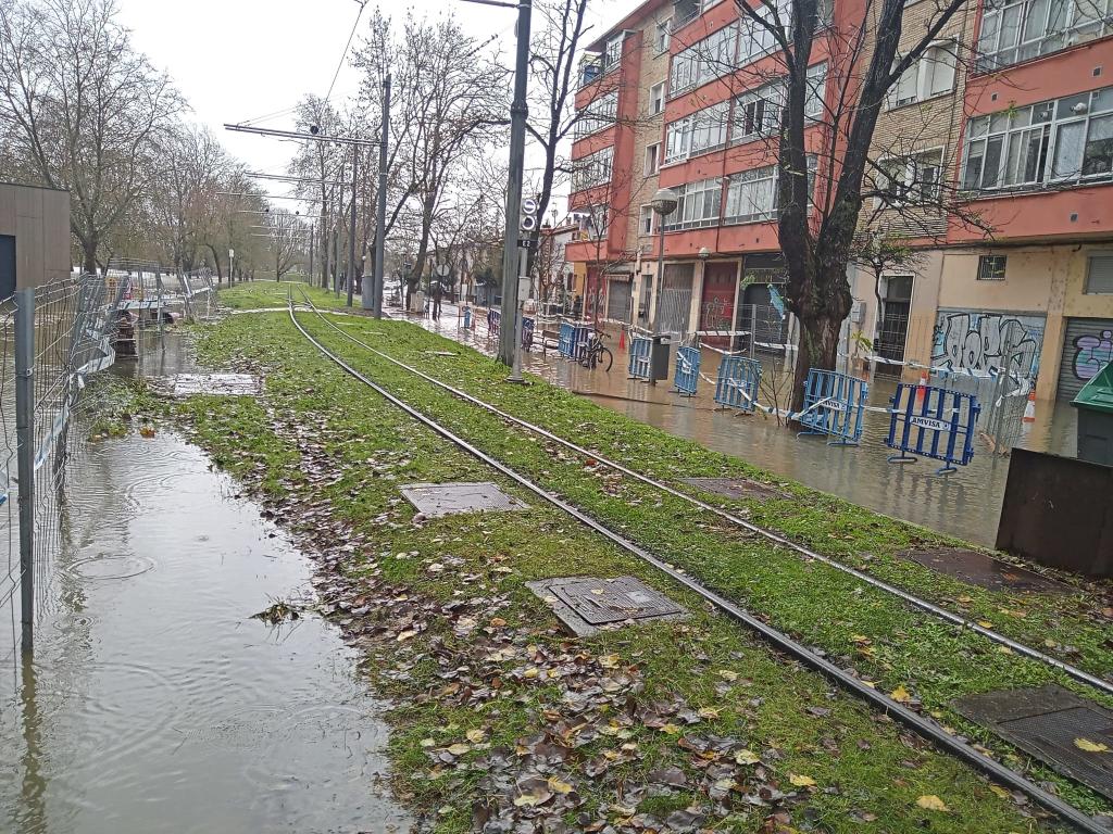 En principio, el agua agecta a los portales entre los números 79 y 87 y a una decena de lonjas, según ha podido comprobar 'in situ' este diario. De hecho, la crecida ha llegado a tal nivel que las vías del tranvía se ven por poco.