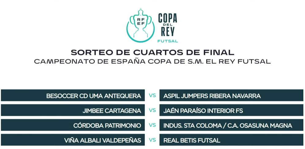 Este martes se ha celebrado el sorteo de cuartos de final de la Copa del Rey de fútbol sala, que se disputará a partido único, a la espera de lo que suceda con el enfrentamiento de octavos entre Industrias Santa Coloma y Osasuna Magna, que se vio aplazado en su día por varios positivos en Covid en el cuadro navarro, y cuyo desenlace se resuelve este miércoles.