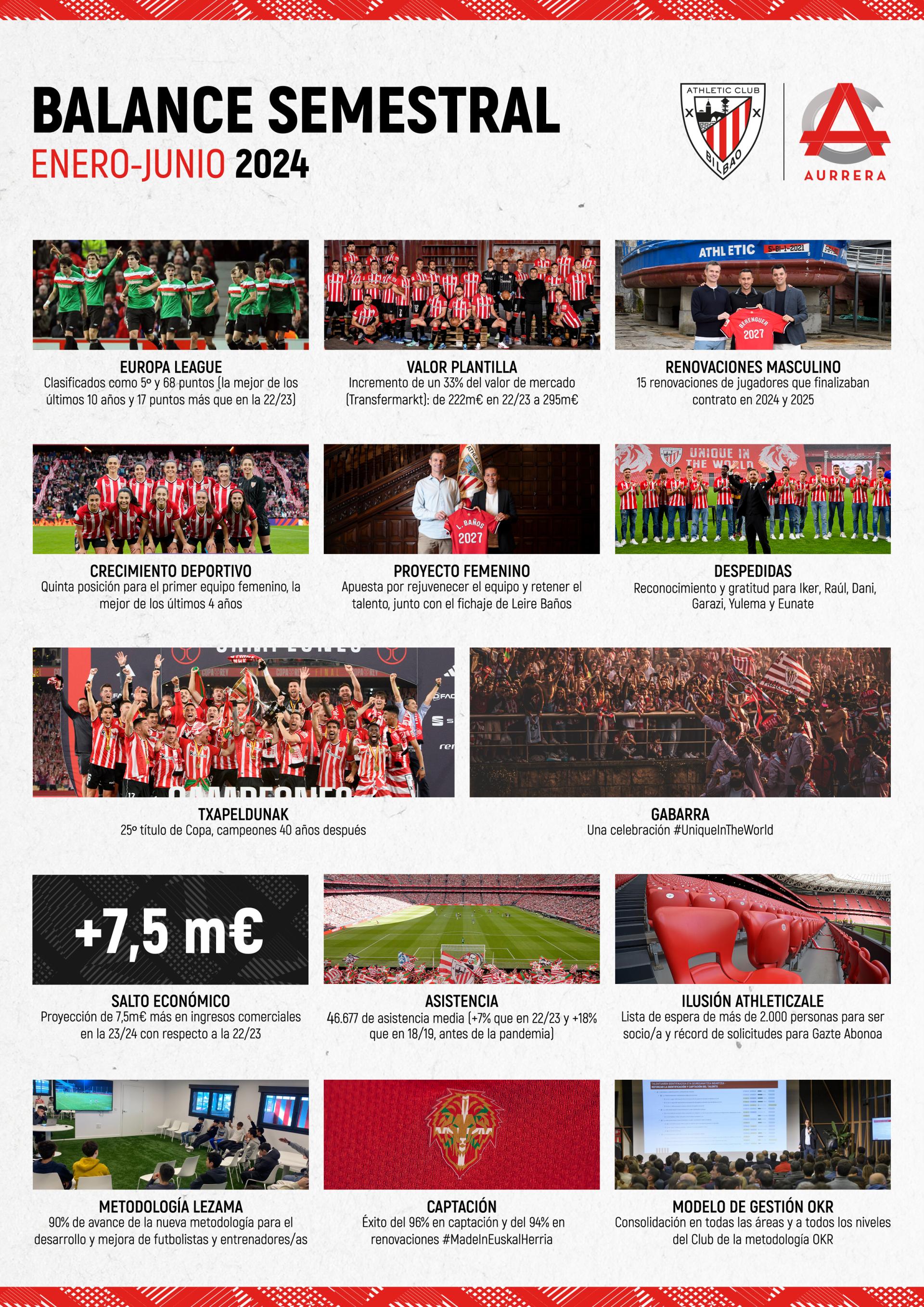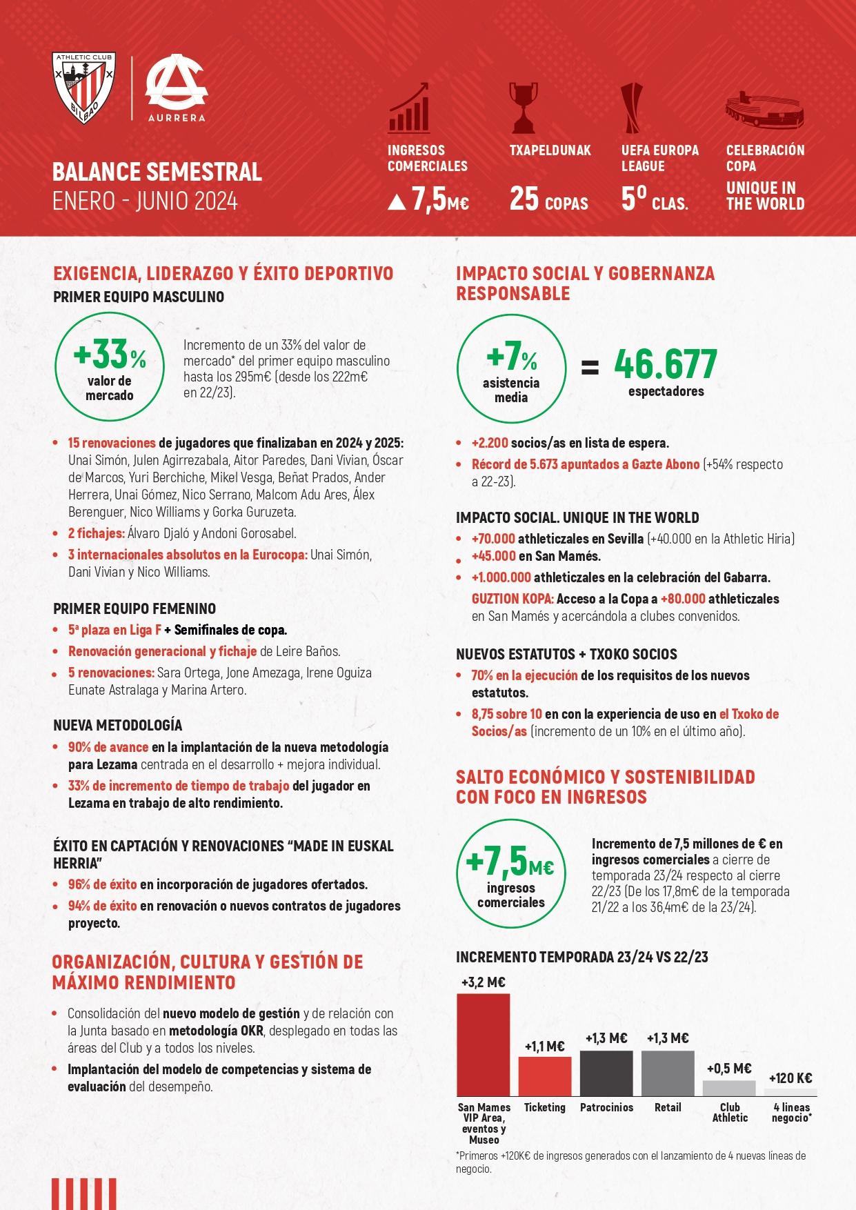 Se trata de un ejercicio de transparencia que permite al Club rendir cuentas a sus socios y socias para que puedan acceder a la hoja de ruta establecida para la entidad hasta 2026. El Athletic Club destaca en la infografía del informe 14 resultados que responden a objetivos marcados por el plan. Los logros conseguidos en el eje deportivo por los primeros equipos, con la consecución del 25 título de Copa como gran hito histórico, centran un balance en el que también sobresale el salto económico: una proyección en esta temporada de un incremento de 7,5 millones de euros por ingresos comerciales con respecto a la temporada anterior.