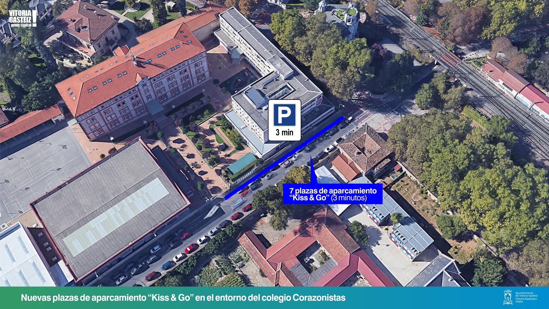 - Corazonistas: Al comienzo de la calle Corazonistas (entre el cruce con el Paseo de las Universidades y la entrada del colegio) se generan 7 plazas de aparcamiento Kiss & Go (tiempo limitado a 3 minutos). Son plazas que pasan de aparcamiento libre a puntos de parking Kiss & Go y que complementan las plazas de 15 minutos existentes en la calle Corazonistas y Paseo de las Universidades.