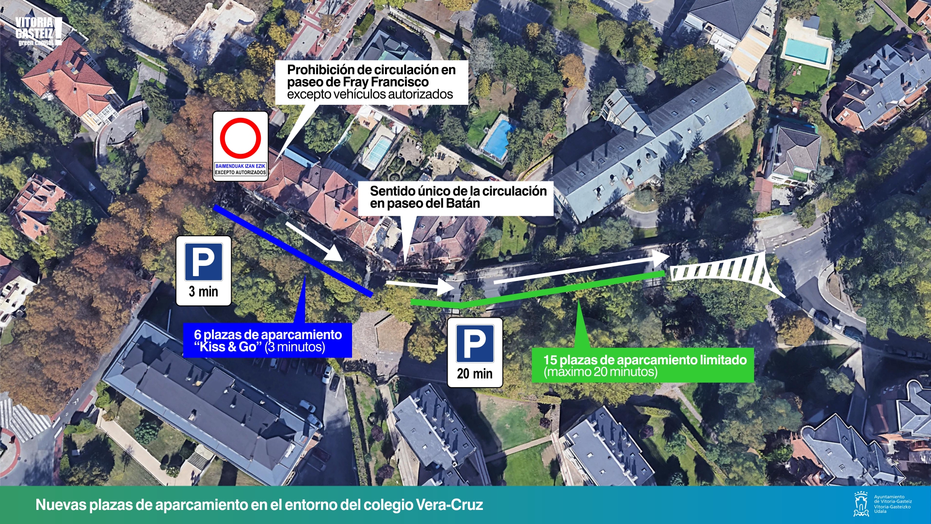- Vera-Cruz: Al comienzo del paseo del Batán (desde su cruce con el paseo de Fray Francisco) se generan 6 plazas de aparcamiento Kiss & Go (tiempo limitado a 3 minutos). A continuación se habilitan otras 15 plazas de aparcamiento reguladas mediante parquímetro donde el tiempo máximo de permanencia será de 20 minutos. El parquímetro facilitará de forma gratuita y obligatoria los tiques de 20 minutos.