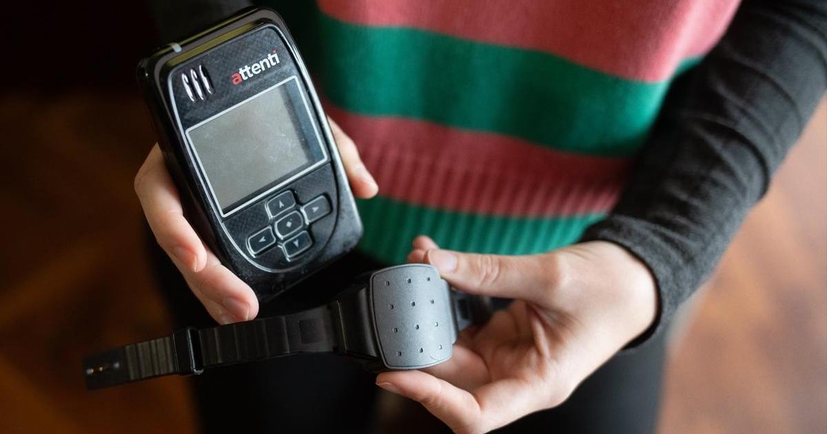 Una persona muestra una pulsera electrónica de geolocalización telemática y su monitor.