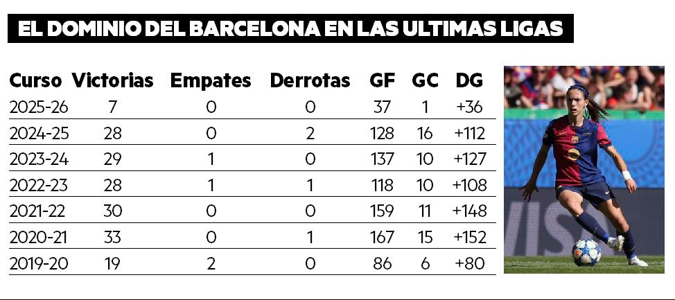 La última derrota del Barcelona en el campeonato doméstico data del 23 de marzo de 2025, ante el Real Madrid (1-3). Además, solo Levante (en 2025, 1-2), Madrid CFF (en 2023, 2-1) y Atlético (en 2021, 4-3) han logrado vencer en liga al conjunto catalán desde 2019. En los 180 partidos que han transcurrido, el Barça ha firmado 174 victorias, cuatro empates y cuatro derrotas con 832 goles a favor y 69 en contra. Un proyecto de dimensión mundial.