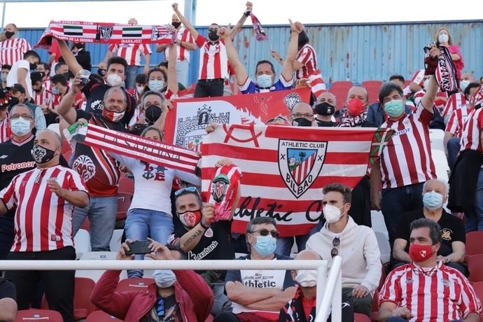 Numerosos aficionados del Athletic acudieron al Francisco de la Hera. Foto: Athletic Club El Burgos salió con un ímpetu desmedido. A por todas. Algo inusual en una final. Una jugada entre Prados, Cabo y Williams acabó con un peligroso centro del último que buscaba desquitarse de la presión inicial burgalesa. Para Nico había una vigilancia especial. El inquieto Juanma intentó sorprender desde lejos. El Burgos seguía demasiado motivado y los cachorros apenas podían salir de su área cuando habían transcurrido diez minutos. Cabo buscaba hacer de las suyas y los del El Plantío no se lo pensaban a la hora de probar a Iru desde lejos. Había que frenar al rival. Núñez puso un balón de oro al que no llegó Artola, muy vigilado. Juanma, excanterano bético, era el peligro personificado e intentó marcharse de cuatro rojiblancos. Pero los cachorros lograron calmar los ánimos del rival, adelantando su línea defensiva, y en busca de su propia personalidad. Las ocasiones de peligro brillaban por su ausencia. Era fuego de artificio. Antes del minuto 40, Saúl Berjón asistió a Juanma, que remató de cabeza forzado, en la mejor ocasión de la primera mitad.