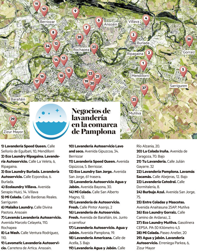 Cada vez es más común ojear una revista del corazón, hablar por el móvil o esperar sentado mientras finaliza la colada en una lavandería de autoservicio. Es un negocio que no para de dar vueltas y en los últimos cinco años el número de establecimientos en Pamplona y Comarca se ha duplicado hasta alcanzar la treintena. El último local, sin ir más lejos, se ha situado esta misma semana en Mutilva y muchas bajeras lucen carteles de próxima apertura.