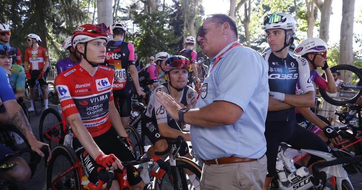El comisario de la UCI comunica al líder de la general, Jonas Vingegaard, y a los demás corredores, los corredores la finalización de la etapa / Efe