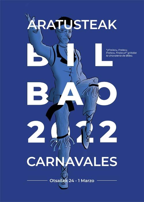Vuelta a los orígenes (Azul Bilbao), el cartel de carnaval de Bilbao 2022 Urtasun ha animado a la gente a participar. "Va a ser más breve porque el sábado es día de más concentración. Trabajamos con Seguridad Ciudadana y Espacio Público porque habrá algún corte de tráfico y vallado pero no masivos como en otras ocasiones".
