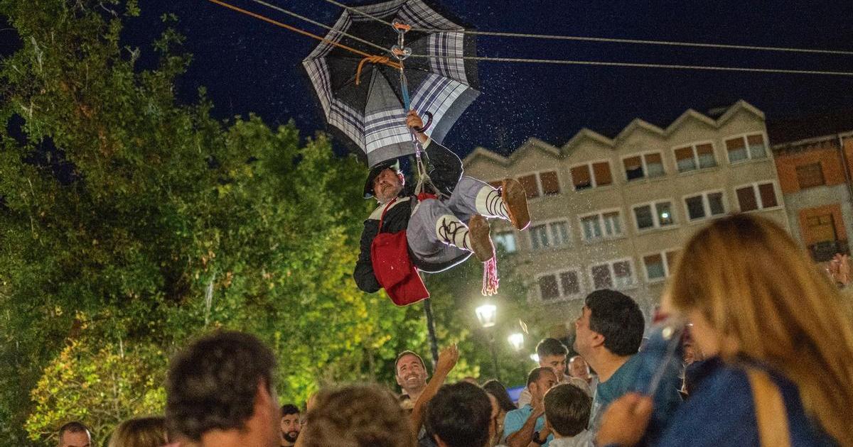 La tradición se enmarca en las fiestas de la calle Barria, tiene más de medio siglo de historia y Carlos Bergado encarna al singular personaje que se tira con txapela, paraguas y puro