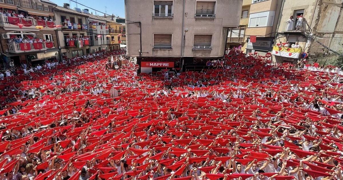 Con las calles llenas hasta la bandera, así como los balcones y terrazas, solo el Himno de las Cortes logró calmar a las enfervorecidas voces que entonaban alegres cánticos festivos. Pañuelos al viento, la plaza se convirtió en un manto rojo durante los segundos previos al lanzamiento del chupinazo.