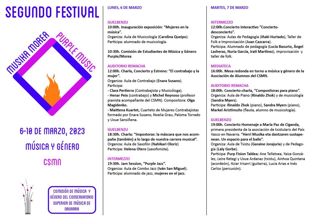 Purple Music-Musika Morea está abierto a todo el público que se quiera acercar al Conservatorio Superior de Música de Navarra. Esta edición vuelve a ofrecer un amplio panorama de actividades en torno a la música y género en 5 intensos días. Así, se celebrarán conciertos (de clásico y de folk), dedicados, en algunos casos, a mujeres compositoras y cuya interpretación, principalmente, correrá a cargo de alumnas intérpretes (piano, contrabajo, violín, violoncello, percusión, acordeón, saxofón, txistu, arpa, clarinete, batería, etc). También se producirá el lanzamiento de la reivindicativa formación de un cuarteto de mujeres contrabajistas; se estrenarán obras de mujeres compositoras y se celebrarán recitales comentados con obras de compositoras históricas prácticamente olvidadas. Sin olvidar los conciertos didácticos y los homenajes a mujeres referentes en la música como la pianista internacional Alicia de Larrocha, en el centenario de su nacimiento; la txistulari Mari Paz de Ciganda (primera presidenta de la Asociación de Txistularis del País Vasco en Navarra) y la arpista Lola Higueras (músico de referencia en la España de la compleja década de 1940). Asimismo, habrá investigación musicológica, con conferencias y mesas redondas en torno al amplio espectro que abarcan los estudios de música y género protagonizadas por alumnado del CSMN (actual o egresado); debates impulsados por la Asociación de Estudiantes del CSMN y, por supuesto, la participación de profesionales de gran prestigio en su campo.