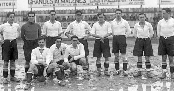 17 de febrero de 1929. Mendizorroza. Debut albiazul en Segunda División. Deportivo Alavés-Deportivo de la Coruña (3-1). De pie (izda. a dcha.): Urquiri, Beristain, Ibarrarán, Olivares, San Martín, Albéniz, Crespo y Modesto Echevarría. Agachados (izda. a d