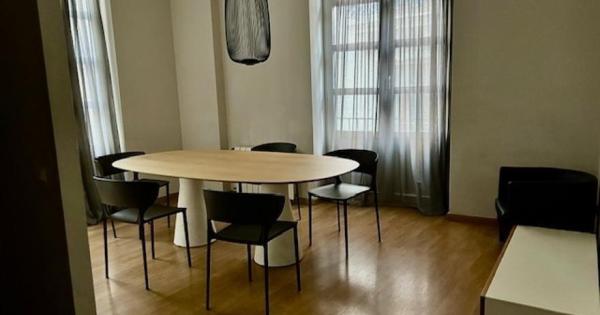 Se trata de una habitación, con dos grandes ventanales de techo a suelo con cortinas, una mesa ovalada en el centro con varias sillas, un sillón y un mueble auxiliar.