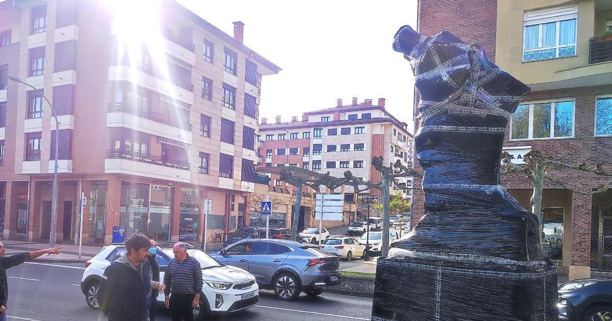 La escultura se colocó la mañana del martes, día de San Martín, en la que avenida Julio Urkixo, junto al palacio Intsausti, pero habrá que esperar hasta la inauguración del domingo para verla al completo, ya que en estos momentos está envuelta en plástico.