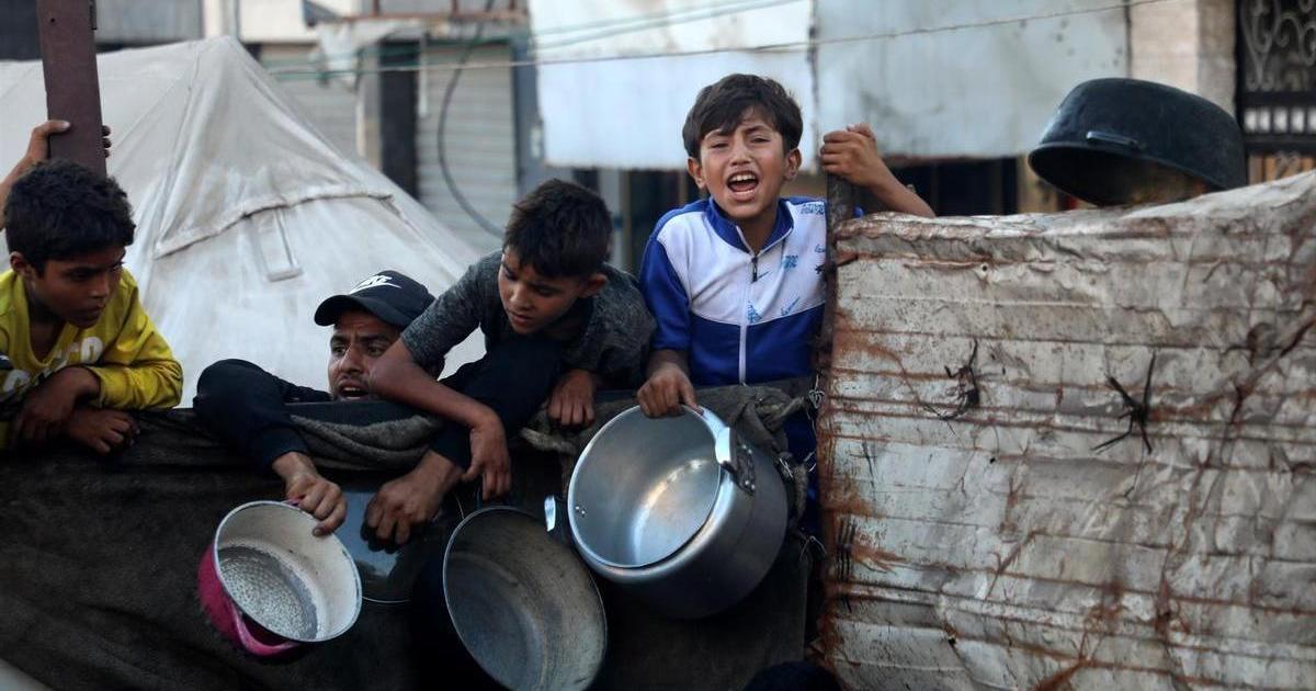 Ciudadanos gazatíes, entre ellos varios niños, esperan para recibir alimentos en la capital de la Franja.