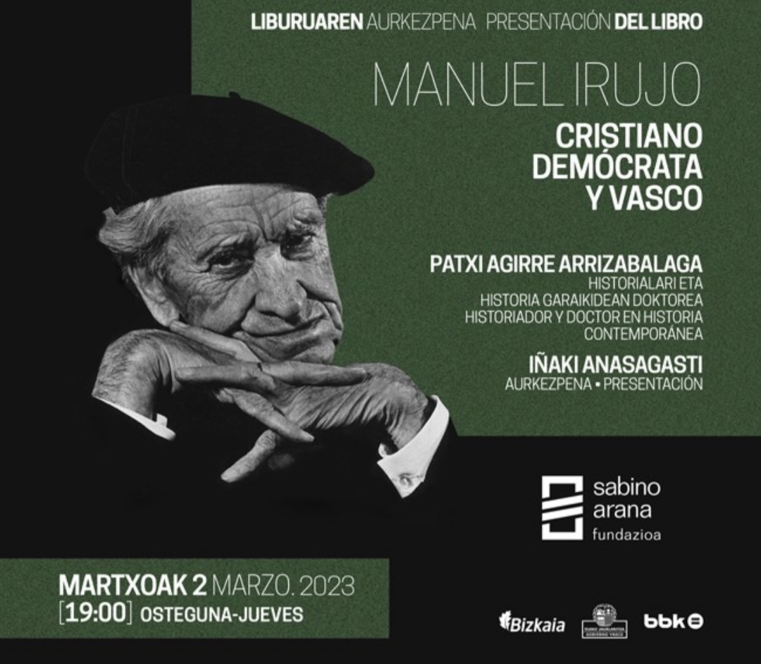 El historiador Patxi Agirre presenta este jueves 2 de marzo en Sabino Arana Fundazioa (Mandobide 6. Bilbao) su libro Manuel Irujo: cristiano, demócrata y vasco junto a Iñaki Anasagasti a las 19:00 horas. En Onda Vasca ha realizado el perfil de uno de los máximos dirigentes del nacionalismo vasco desde los años 30 hasta su fallecimiento en 1981.