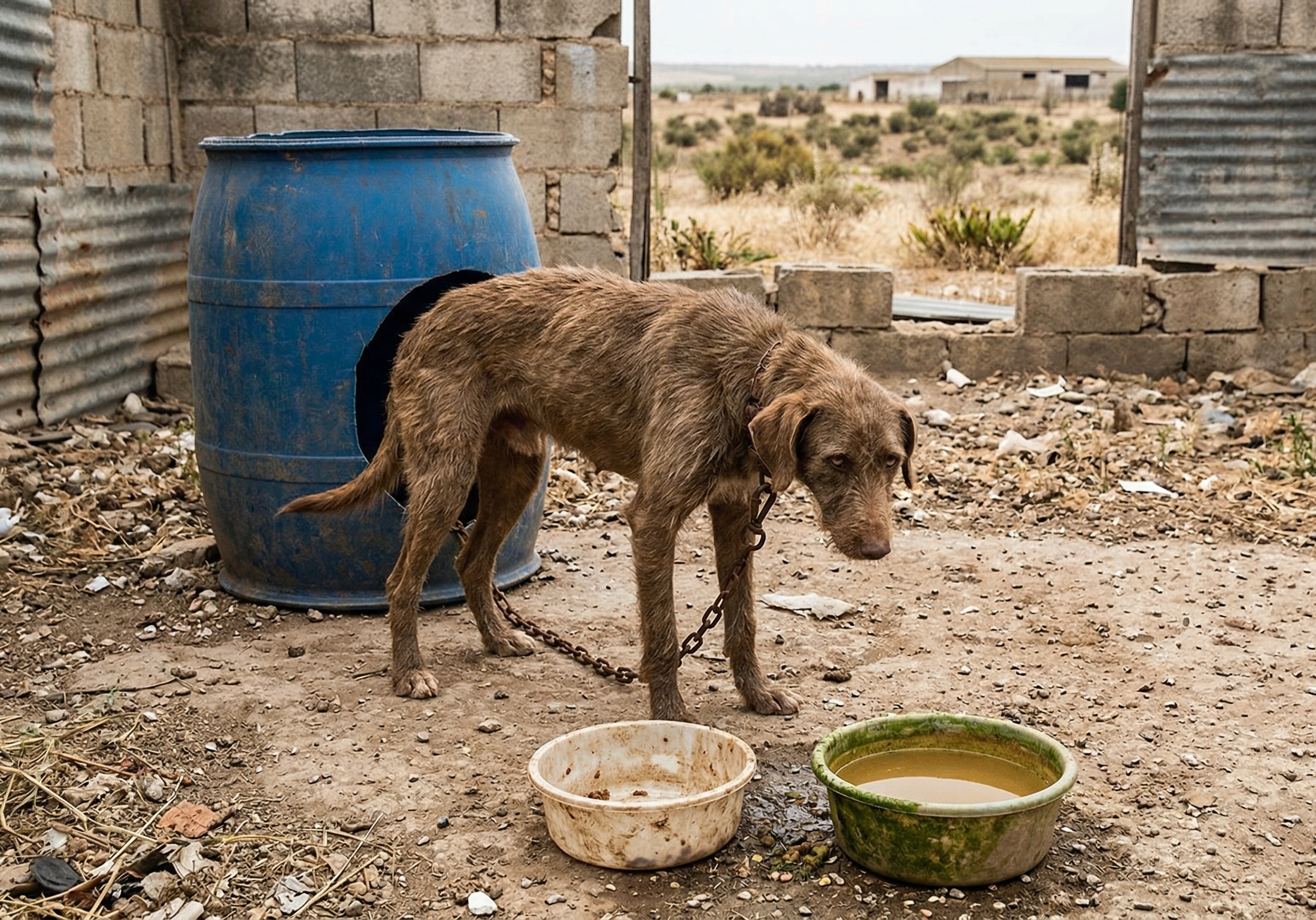 Describe alojamientos consistentes en bidones oxidados, sin aislamiento ni condiciones adecuadas, que pueden alcanzar temperaturas extremas en verano. A esto se suma la situación de animales que permanecen solos en fincas durante días y solo reciben atención puntual los fines de semana.