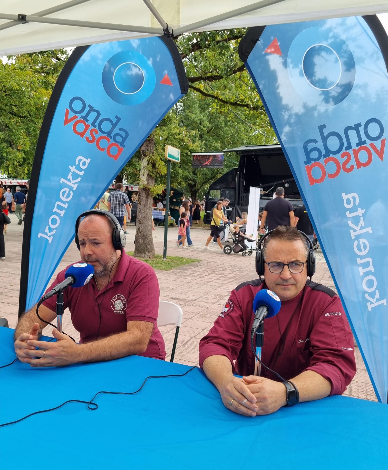 José Mari Aguirre y Jokin Salaberri, de la Cofradía de la Putxera, visitan el set de Onda Vasca en el programa especial desde la Feria Agrícola y Ganadera de Loiu, para explicar cómo se elabora el marmitako en putxera en este día tan especial.