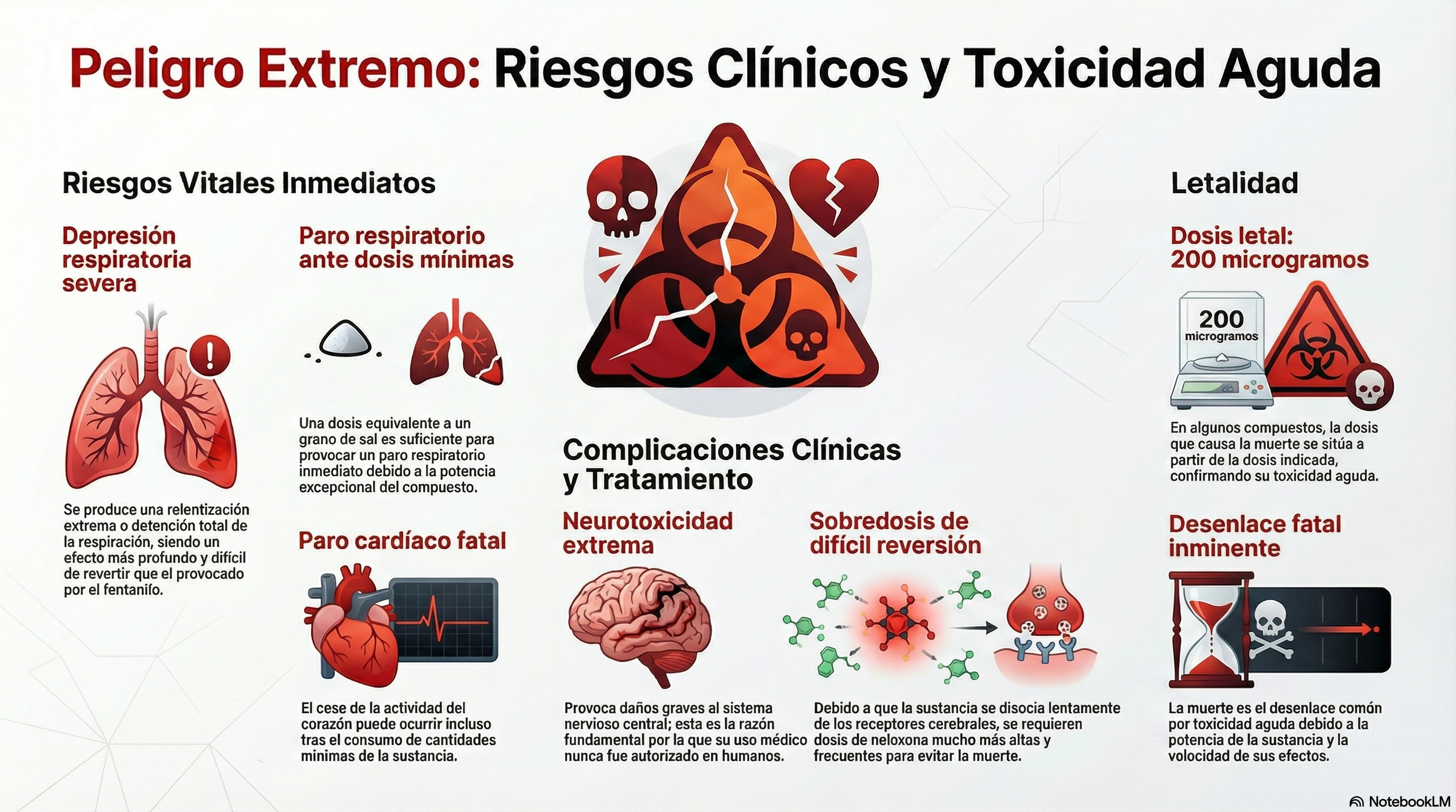 Su peligrosidad radica en una potencia sin precedentes: algunos compuestos son 1.000 veces más fuertes que la morfina. Según expertos médicos, la distancia entre una dosis recreativa y una letal es mínima, lo que dispara el riesgo de sufrir una depresión respiratoria severa o un paro cardíaco. Además, las sobredosis son más difíciles de revertir, requiriendo dosis mucho mayores de naloxona que las habituales.